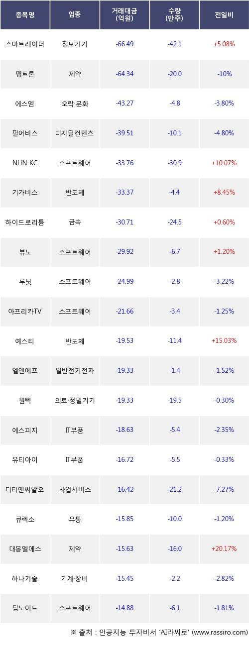 외국인 투자자의 순매도 상위 20개 종목은 스마트레이더시스템, 펩트론, 에스엠, 펄어비스, NHN KCP, 기가비스, 하이드로리튬, 뷰노, 루닛, 아프리카TV등이다.