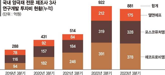 27일 관련 업계에 따르면 에코프로비엠, 포스코퓨처엠, 엘앤에프 등 양극재 3사의 올해 3·4분기 누적 R&D 투자금액은 881억원으로 같은 기간 기준 5년 만에 처음 줄었다.