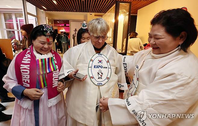 (파리=연합뉴스) 황광모 기자 = 2030 세계 박람회 개최지를 결정하는 173차 세계 박람회 기구(BIE) 총회를 하루 앞둔 27일 오후(현지시간) 프랑스 파리에 있는 한국 문화원에서 열린 부산 세계박람회 홍보 행사에서 현지인이 한복체험을 하고 있다. 2023.11.27