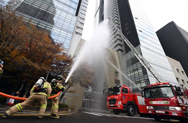 민·관 합동 소방안전 훈련이 실시된 27일 서울 광진구 ‘더클래식 500’에서 소방대원들이 화재진압 훈련을 하고 있다. 이날 훈련은 초고층 밀집시설에 거주하는 고령층 주민을 대상으로 이뤄졌다. 최현규 기자