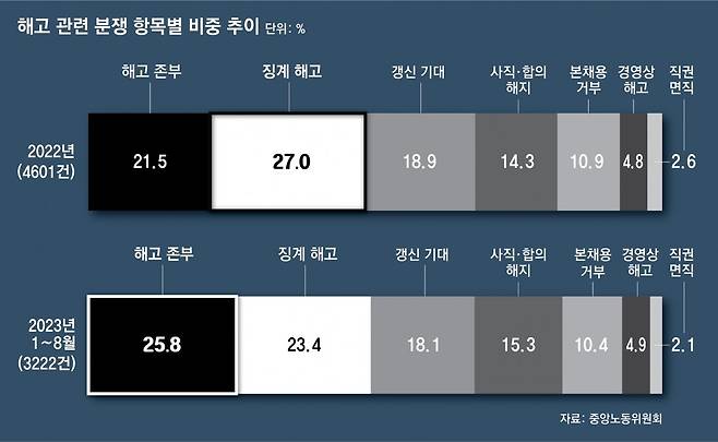 ‘해고 존부’ 사건의 비중은 2021년 15.0%에서 매년 증가하는 추세다. 해고가 맞는지 다투는 분쟁이 많아지는 건 이에 대한 근로자와 사용자의 인식이 다르기 때문으로 풀이된다. 예를 들어 회사 대표가 직원에게 “이렇게 일하라면 사직서를 쓰라”고 말한 것을 두고 대표는 “직원의 근무 태도를 바로잡으려는 의도”라고 주장하는 반면 직원은 해고로 받아들인다는 것이다.