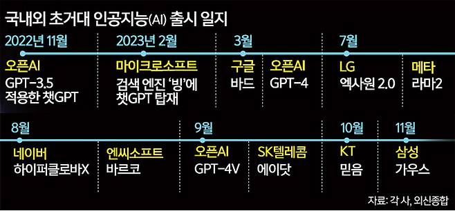 챗GPT 이후 다른 기업들도 AI를 잇따라 내놓았다. 마이크로소프트 ‘빙’, 구글 ‘바드’, xAI ‘그록’ 등이 모두 올해 등장했다. 국내에서는 네이버 ‘하이퍼클로바X’, LG ‘엑사원’, 삼성 ‘가우스’, SK텔레콤 ‘에이닷’, KT ‘믿음’ 등이 출시됐다. 출처를 제시하거나, 유머를 탑재하는 등 차별화하는 모습이다.