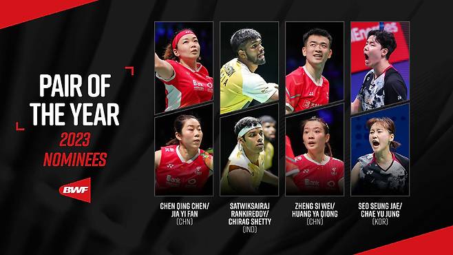 한국 배드민턴은 안세영 외에 다른 3개 부문에서 후보자를 배출해 눈길을 끌었다. 특히 서승재(26·삼성생명)는 올해의 남자 선수와 복식 2개 부문에 후보로 뽑혔다. 복식 부문은 세계선수권 우승을 합작했던 채유정(28·인천국제공항)과 함께 이름을 올렸다.