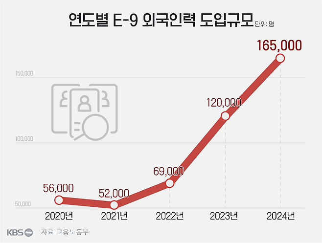 내년에 고용허가제로 E-9 비자를 발급받아 국내에서 일할 수 있는 외국인 근로자는 16만 5천 명. 규모만으로도 역대 최대입니다. 2021년에 비하면 3배 넘게 수가 늘었습니다.