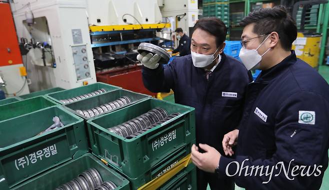 | ▲ 2022년 1월 10일 당시 윤석열 국민의힘 대선후보가 중소기업 경영 및 근로환경 개선 현장 방문을 위해 인천 남동공단 경우정밀을 찾은 가운데 공장 관계자와 현장을 둘러보고 있다. |