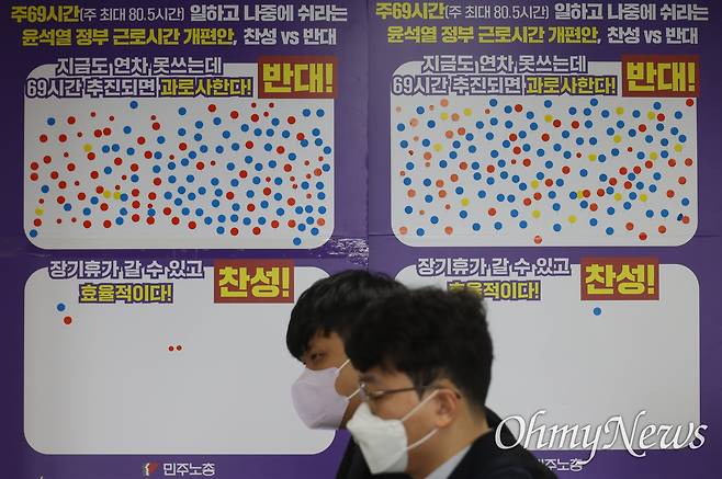 여론조사에 근거한다니, 대번에 질문이 나온다.10명 중 8명이 반대하는 재활용품 규제 철회는? 반대가 60%를 넘나들었던 용산 대통령실 이전은? 정책 결정 과정에서 여론조사를 앞에 내세우는 방식이 정권 책임을 회피하는 수단으로 선택적으로 활용되고 있다는 점은 감안할 필요가 있겠다. 어떻게든 '69시간'을 포기하지 않겠다는 정부의 의지가 도드라진다.