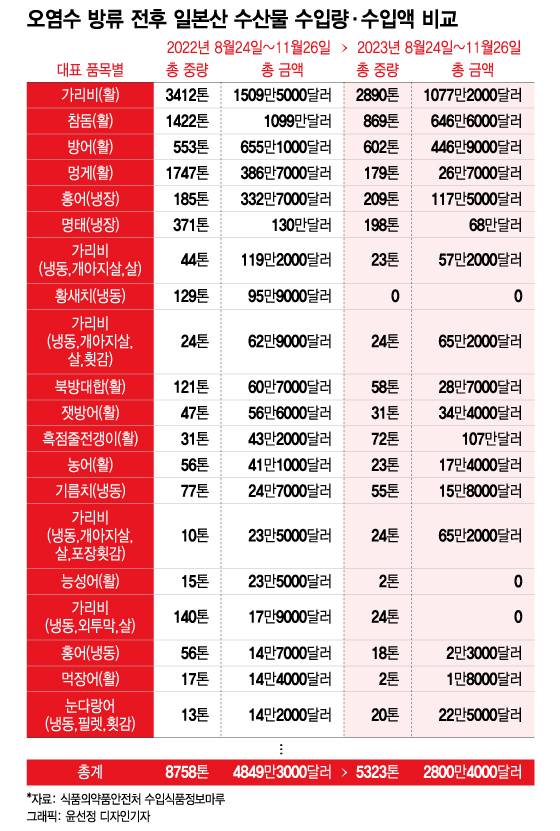 28일 식품의약품안전처 수입식품정보마루에 따르면 지난 8월24일부터 지난 26일까지 약 3개월간 국내 수입된 일본산 수산물 수입량은 5323톤으로 전년 동기 8758톤 대비 39.2% 감소했다. 같은 기간 수입액은 2800만달러(약 365억원)로 전년 동기 4849만달러(약 633억원) 대비 42.2% 줄어들었다.