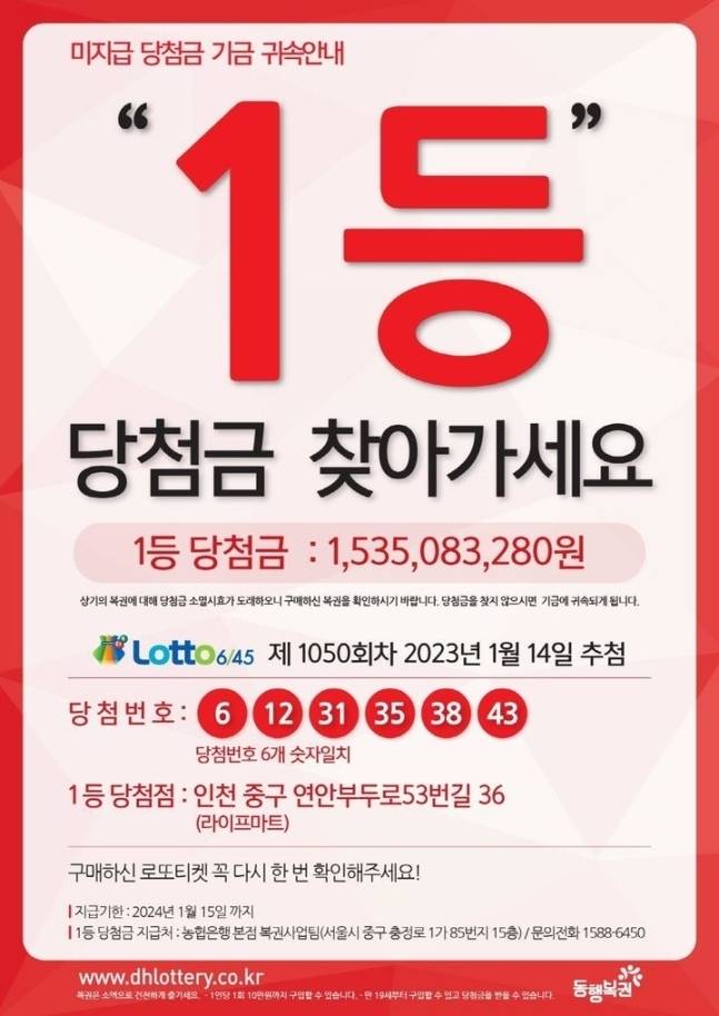 당첨 번호는 '6, 12, 31, 35, 38, 43'이었으며, 주인이 아직 나타나지 않은 이 마지막 1등권은 인천 중구에 있는 복권 판매점에서 팔린 로또였습니다.