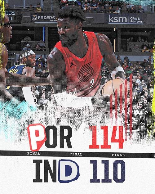 포틀랜드는 28일(한국시간) 미국 인디애나주 인디애나폴리스 뱅커스 라이프 필드하우스에서 열린 2023-24 NBA 정규리그 인디애나와의 경기에서 114-110으로 승리했다.