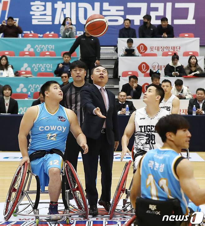 (서울=뉴스1) = 최욱철 한국휠체어농구연맹(KWBL) 총재가 28일 오후 경기도 성남 실내체육관에서 열린 '2023 KWBL 휠체어농구리그' 챔피언결정전 1차전 코웨이 블루휠스와 춘천 타이거즈 경기에서 시구하고 있다. 1차전은 75대 62로 춘천타이거즈가 승리했다. (한국휠체어농구연맹 제공) 2023.11.28/뉴스1