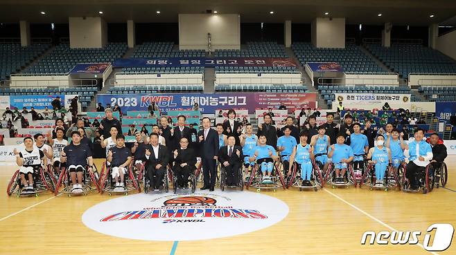(서울=뉴스1) = 28일 오후 경기도 성남 실내체육관에서 열린 '2023 KWBL 휠체어농구리그' 챔피언결정전 1차전 코웨이 블루힐스와 춘천 타이거즈 경기에 앞서 선수 등이 기념촬영을 하고 있다.