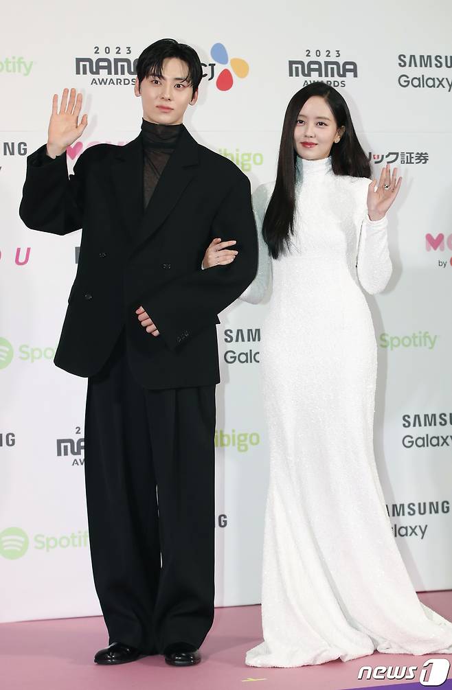 (도쿄(일본)=뉴스1) 권현진 기자 = 배우 황민현과 김소현(오른쪽)이 28일 일본 도쿄돔에서 열린 ‘2023 마마 어워즈(2023 MAMA AWARDS)’에서 포즈를 취하고 있다. 2023.11.28/뉴스1