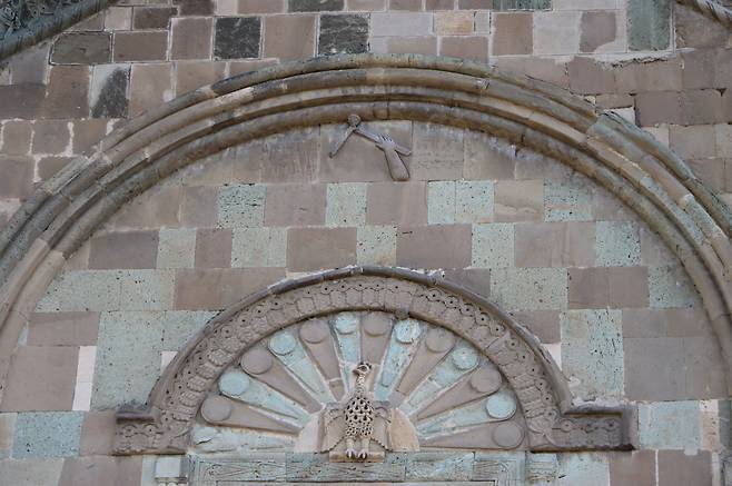 동쪽벽에는 또한 아치형 상부에 공작 꼬리 장식이 있고, 그 위 왼쪽에 날개를 편 독수리와 사자가 보인다. 독수리는 하늘을, 사자는 땅을 대표하는 동물로 보인다. 그리고 창문 아래에는 멜키체덱 1세에 의해 이 성당이 만들어졌다는 명문이 새겨져 있다고 한다.