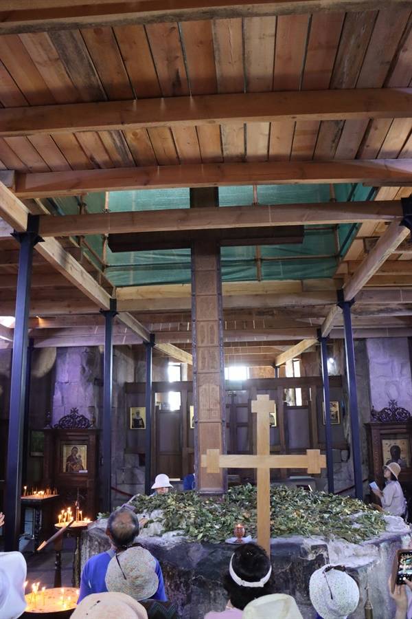 이 출입문을 들어서면 수도원 한 가운데 둥근 제단 위에 십자가를 만날 수 있다. 성녀 니노 십자가로 불리지만, 현재는 근래에 세워진 십자가가 자리 잡고 있다. 십자가 위로 8각형의 돔이 있고, 사방에 창문이 있어 빛이 은은하게 들어온다. 동쪽으로 제단과 지성소가 위치한다. 서쪽에는 왕과 여성을 위한 기도실이 위치한다. 벽에는 프레스코화와 성화가 그려져 있다.