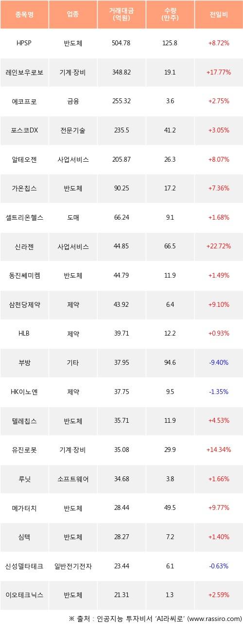 외국인 투자자의 순매수 상위 20개 종목은 HPSP, 레인보우로보틱스, 에코프로, 포스코DX, 알테오젠, 가온칩스, 셀트리온헬스케어, 신라젠, 동진쎄미켐, 삼천당제약등이다.