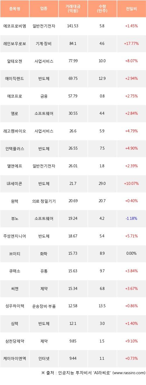 기관 투자자의 순매수 상위 20개 종목은 에코프로비엠, 레인보우로보틱스, 알테오젠, 에이직랜드, 에코프로, 엠로, 레고켐바이오, 인텍플러스, 엘앤에프, LB세미콘등이다.