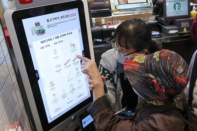 | ▲ 2022년 10월 17일, 서울 종로구 롯데리아 동묘역점에서 열린 디지털 약자 어르신 키오스크 교육에 참여한 서울재가노인복지협회 소속 어르신들이 키오스크로 음식을 주문하는 과정을 체험하고 있다. |