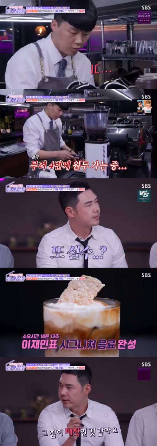 두 번째로는 이재민이 나섰다. 변수가 싫어서 글라인더까지 직접 가져온 이재민은 시작과 동시에 실수를 하더니 어렵게 내린 커피를 연이어 버리는 모습을 보였다. 거기에 거품기까지 말을 듣지 않았고, 지켜보던 유정수는 답답한 표정을 지었다.