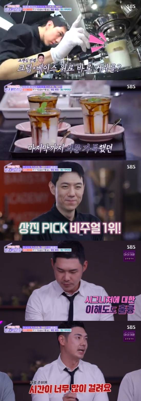 마지막 후보자 차민석은 "죽기살기로 해보겠다"면서 엄청난 장비를 들고 나왔다. 고구마 크림과 베이스 위에 바로 커피를 올리는 퍼포먼스를 펼쳤다. 마무리로 메밀 시럽과 애플민트까지 올려 '토지라떼'를 완성했다.
