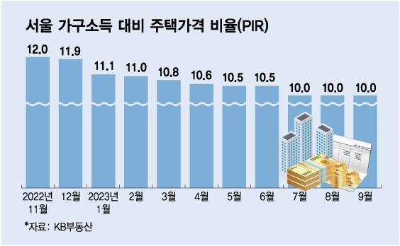28일 KB부동산 월간주택가격동향에 따르면 지난 9월 기준 서울의 PIR은 10으로 집계됐다. 지난 6월 조사된 10.5보다 반년 가량 줄어든 수치다.