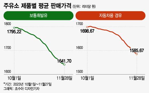 국내 기름값도 7주 연속 내림세를 보였다. 리터(ℓ)당 휘발유 가격은 1641.7원, 경유 가격은 1585.67원이다. 이 또한 유류세 인하 조치를 연장한 10월 중순(18일·휘발유 1772.84원, 경유 1688.47원)에 비해 크게 내린 수준이다.