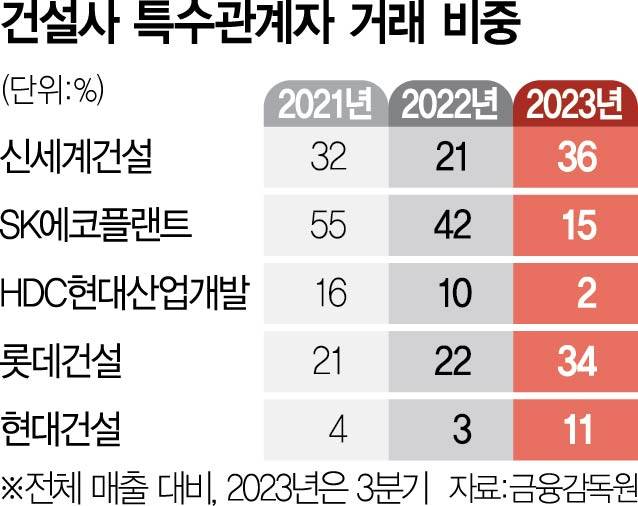 대형 건설사들의 내부거래 비중도 점차 낮아지는 추세다. SK에코플랜트는 2021년 55%에 달했으나 올 3분기 15%까지 낮췄다. SK하이닉스 청주 M15 페이즈2 공사 등이 마무리된 효과다. HDC현대산업개발(294870)도 같은 기간 16%에서 2%까지 낮아졌다. 반면 주요 계열사의 해외비중이 높은 건설사는 내부거래 비중이 높아지고 있다. 롯데건설은 롯데케미칼의 인도네시아 석유화학단지 공사에 참여하며 내부거래 비중이 21%에서 34%로 늘었다. 현대건설(000720)은 현대자동차그룹이 미국 조지아주에 조성하는 전기차 전용 신공장의 시공을 맡아 비중이 4%에서 11%로 확대됐다.