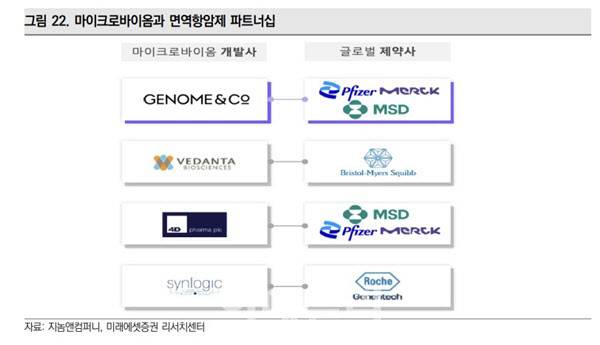 미래에셋증권 리서치센터에 따르면 마이크로바이옴 항암 치료제는 대부분 면역항암제와 병용 임상을 진행하고 있습니다. 대표적인 기업이 영국 4D파마, 베단타 바이오사이언스, 엔테롬, 지놈앤컴퍼니(314130) 등입니다. 이 중 지놈앤컴퍼니는 위암과 담도암을 적응증으로 하는 GEN-001을 개발 중입니다. 개발 속도가 가장 빠른 것은 물론 세계 최초로 마이크로바이옴 항암 효과를 입증했습니다.