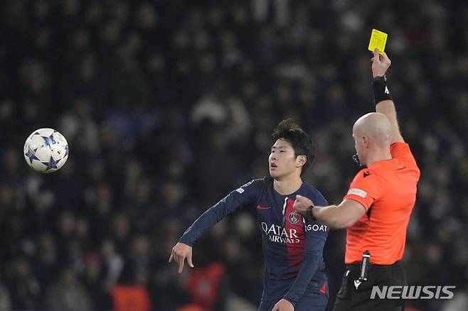 [파리=AP/뉴시스] 파리 생제르맹(PSG)의 이강인이 28일(현지시각) 프랑스 파리의 파르크 데 프랭스에서 열린 2023~24 유럽축구연맹(UEFA) 챔피언스리그(UCL) 조별리그 F조 5차전 뉴캐슬 유나이티드와 경기 후반 9분 심판으로부터 경고를 받고 있다. 이강인은 82분을 소화했고 PSG는 후반 추가 시간 킬리안 음바페의 PK 만회 골로 1-1 무승부를 기록해 조 2위에 자리했다. 2023.11.29.