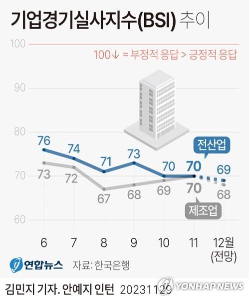 제조업과 비제조업을 종합한 전산업 업황 BSI는 11월 70으로 전월과 동일했다.