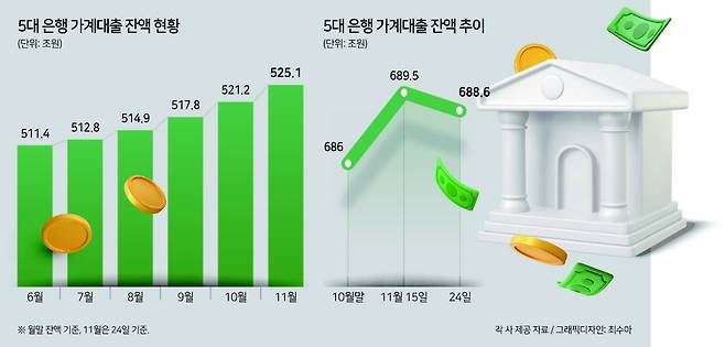 ▶주담대 ‘최대’ 증가폭 기록했지만...‘부채축소’ 노력은 차츰 반영=29일 금융권에 따르면 이달 24일 기준 5대 시중은행(KB국민·신한·하나·우리·NH농협)의 주담대 잔액은 525조1076억원으로 전달 말(521조2264억원)과 비교해 3조8812억원 늘어난 것으로 집계됐다. 이는 올해 월별 최대 증가폭을 보인 지난 10월(3조3676억원)과 비교해서도 5000억원가량 높은 수치다. 이달 들어 올해 가장 빠른 속도의 주담대 증가세가 나타난 셈이다.