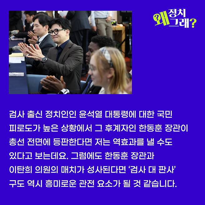 검사 출신 정치인인 윤석열 대통령에 대한 국민 피로도가 높은 상황에서 그 후계자인 한동훈 장관이 총선 전면에 등판한다면 저는 역효과를 낼 수 있다고 보는데요. 한 장관과 이 의원의 매치가 성사된다면 ‘검사 대 판사’ 구도 역시 흥미로운 관전 요소가 될 것 같습니다."