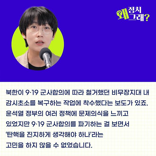 "북한이 9·19 군사합의에 따라 철거했던 비무장지대 내 감시초소를 복구하는 작업에 착수했다는 보도가 이어지고 있습니다. 윤석열 정부의 여러 정책에 문제의식을 느끼고 있었지만 9·19 군사합의를 파기하는 걸 보면서 ‘탄핵을 진지하게 생각해야 하나’라는 고민을 하지 않을 수 없었습니다.