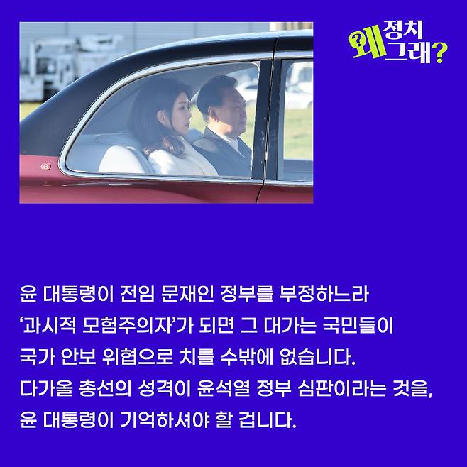 윤 대통령이 전임 문재인 정부를 부정하느라 ‘과시적 모험주의자’가 되면 그 대가는 국민들이 국가 안보 위협으로 치를 수밖에 없습니다. 다가올 총선의 성격이 윤석열 정부 심판이라는 것을, 윤 대통령이 기억하셔야 할 겁니다."