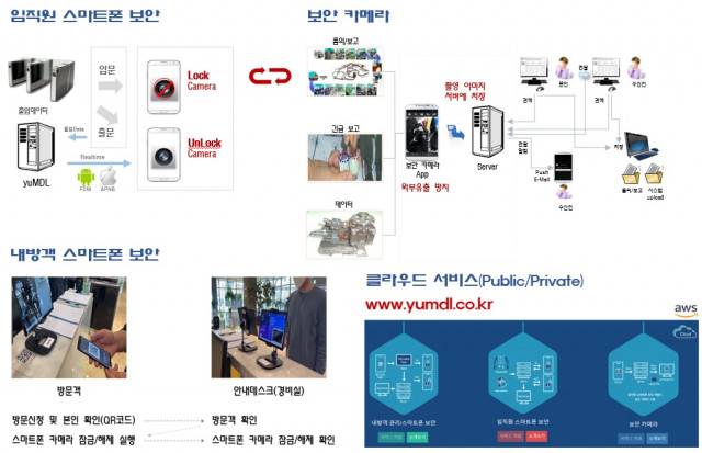 yuMDL은 스마트폰 카메라 촬영을 통제해 기업 내 정보 유출을 방지하는 클라우드 서비스다. 클라우드 서비스로 별도 구축 기간 없이 바로 적용할 수 있고, 비용도 합리적이라 도입 기업의 만족도가 크다. 서비스는 적용 대상에 따라 임직원의 스마트폰 카메라 촬영을 제한하는 '임직원 스마트폰 보안'과 방문객의 스마트폰 카메라 촬영을 제한하는 '내방객 스마트폰 보안'을 제공한다.