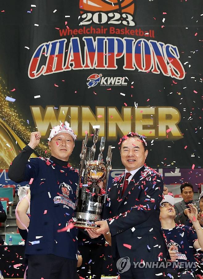 (서울=연합뉴스) 29일 경기도 성남 실내체육관에서 열린 '2023 KWBL 휠체어농구리그' 챔피언결정전 2차전 코웨이블루휠스와 춘천타이거즈 경기에서 최욱철 KWBL 총재(오른쪽)가 이광호 춘천타이거즈 단장에게 우승 트로피를 전달하며 기념 촬영하고 있다.