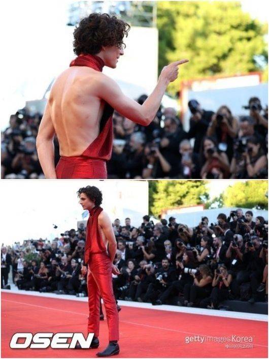 샬라메는 지난 해 제 79회 베네치아 국제 영화제에 영화 '본즈 앤 올' 레드카펫에 참석, 일반적으로 '여성의 옷'으로 받아들여지는 패션을 자랑했다. 강렬한 레드 컬러의 시원하게 드러내는 백리스 탑. 목에 끈을 묶는 홀터넥 형식으로 치명적인 매력을 더했다. 잔근육은 덤. 여기에 스키니 바지로 마른 몸의 섹시한 비주얼을 자랑했다. 이 옷은 디자이너 하이더 아커만의 의상.
