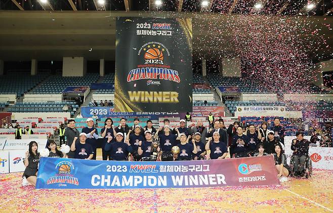 [서울=뉴시스] 김금보 기자 = 29일 오후 경기도 성남시 성남실내체육관에서 열린 '2023 KWBL 휠체어농구리그' 챔피언결정전 2차전 코웨이블루휠스와 춘천타이거즈 경기, 챔피언을 차지한 춘천타이거즈 선수단이 세레머니를 하고 있다. (사진=한국휠체어농구연맹 제공) 2023.11.29. photo@newsis.com *재판매 및 DB 금지