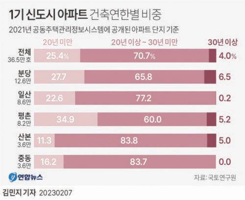 주로 1기 신도시가 적용 대상이 된다. 국토부에 따르면 성남분당, 고양일산, 안양평촌, 군포산본, 부천중동 등 5개 1기 신도시 중 30년이 지난 주택단지는 올해 말 기준 156개(13만1454가구)다. 전체 400개(27만3419가구)의 48%(가구 기준)에 이른다.