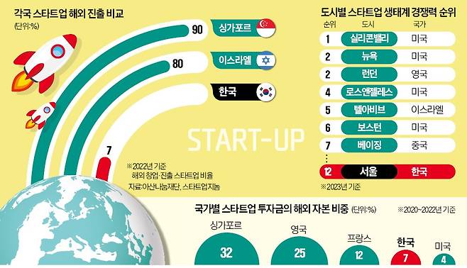 보고서에 따르면 2022년 기준 해외 시장에 진출했거나 해외에서 창업한 국내 스타트업은 300여 개로 집계됐다. 전체 스타트업에서 비중으로 따지면 7%에 불과했다. 반면 싱가포르와 이스라엘은 같은 기준으로 각각 90%, 80%에 달했다.