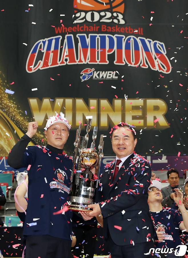 (서울=뉴스1) = 최욱철 한국휠체어농구연맹(KWBL) 총재(오른쪽)가 29일 오후 경기도 성남 실내체육관에서 열린 '2023 KWBL 휠체어농구리그' 챔피언결정전 2차전에서 우승한 춘천타이거즈의 이광호 단장에게 우승 트로피를 전달하고 있다. (한국휠체어농구연맹 제공) 2023.11.29/뉴스1