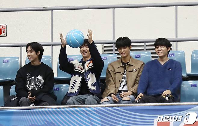 (서울=뉴스1) = 아이돌그룹 BXB(비엑스비)가 29일 오후 경기도 성남 실내체육관에서 열린 '2023 KWBL 휠체어농구리그' 챔피언결정전 2차전 코웨이블루휠스와 춘천타이거즈 경기에서 기념공을 받고 있다. 2차전은 78대 68로 춘천타이거즈가 승리했다. (한국휠체어농구연맹 제공) 2023.11.29/뉴스1
