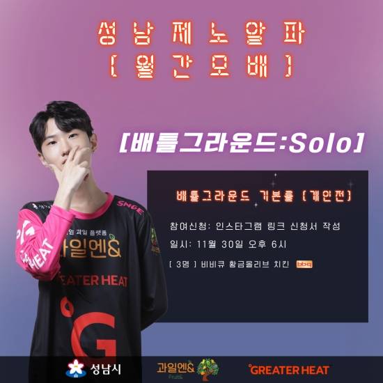 성남시를 대표하는 프로게임단 성남GE(성남 제노알파)는 30일 11월 '월간모배'를 진행한다고 밝혔다.