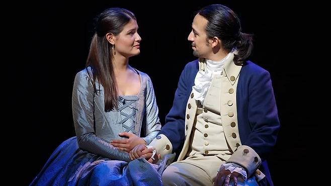 | ▲ 뮤지컬 <해밀턴>의 브로드웨이 초연 공연 사진. 중국계 미국인 배우 필리파 수가 일라이자 해밀턴 역을 맡았다. |