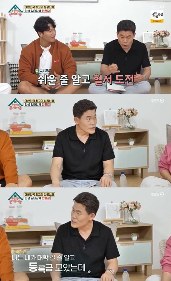 결국 1년을 버렸다는 그가 다시 공부한 계기는 아버지 때문이었다. 전한길은 "고3부터 자취했다. 아버지 농장일 도왔는데 갑자기 아버지가 부르더니 무릎을 꿇으라고 하더라. 대학 갈 줄 알고 등록금 준비해놨는데 이럴 수 있냐 하더니 펑펑 우시더라. 지금까지도 그런 충격이 없다"며 "다음날 바로 자취방으로 가서 공부했다"고 밝혔다.