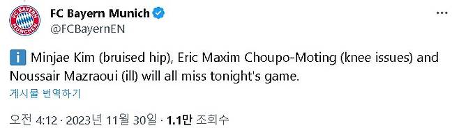 바이에른 뮌헨은 공식 소셜네트워크서비스(SNS)를 통해 "김민재(엉덩이 타박상), 에릭 막심 추포모팅(무릎 문제), 마즈라위(감기) 모두 오늘 경기에 결장한다"라고 알렸다.