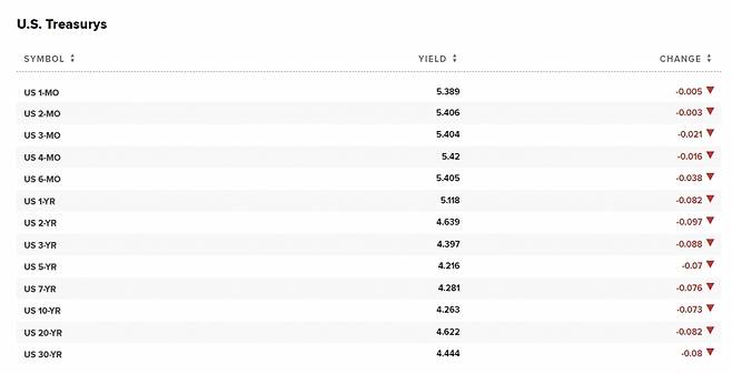 이날 10년 만기 국채수익률은 9월 이후 처음으로 4.2%대를 기록하면서 시장의 안정세를 나타냈다. 10년물 금리는 전 거래일보다 7bp 이상 빠진 4.26%대를 나타냈다. 20년물과 30년물 금리도 각각 8bp 이상 떨어져 4.6%대와 4.4%대를 기록했다. 단기물인 2년물도 9bp 이상 하락한 4.64%대를 나타냈다.