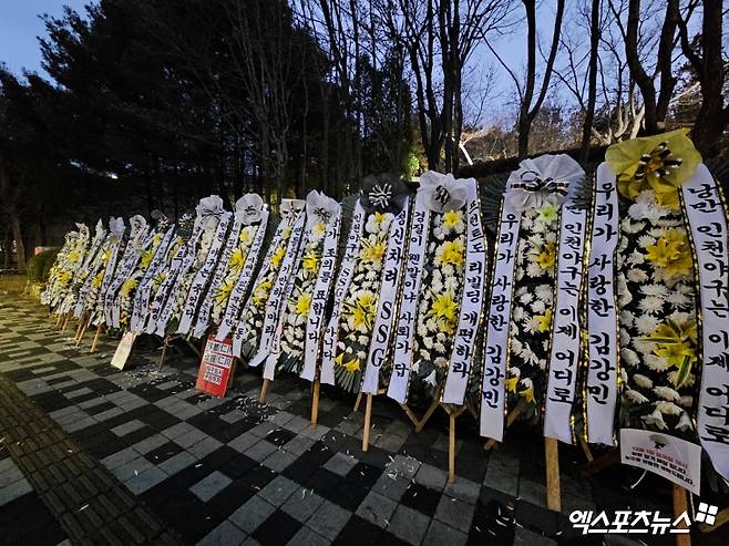 (엑스포츠뉴스 유준상 기자) 찬 바람이 불던 29일 오전 11시, SSG랜더스필드가 위치한 인천 문학경기장 북문 인근의 대로변에 수십 개의 근조화환이 도착했다.