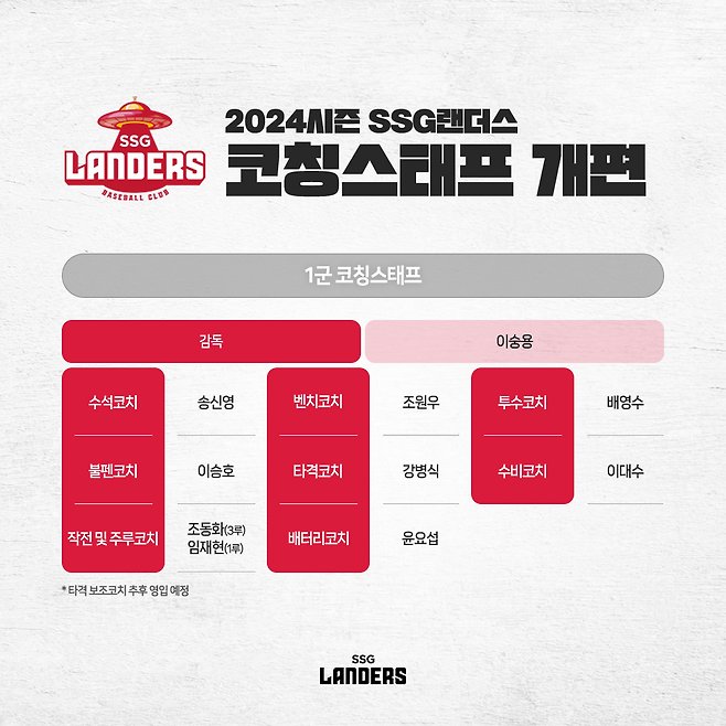 송신영 수석코치, 조원우 벤치코치, 배영수 투수코치, 이승호 불펜코치, 강병식 타격 코치, 이대수 수비코치, 조동화(3루)-임재현(1루) 작전주루 코치, 윤요섭 배터리 코치가 각 분야를 담당한다. 파트별 전문성, 코칭 능력에 집중했다는 게 SSG의 설명이었다.