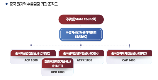 중국은 전세계에 원전 건설 바람이 불자 원전 수출을 핵심 추진 과제로 선정해 국가 역량을 총동원하고 있다. 국무원 산하인 국유자산감독관리위원회 아래에 중국핵공업집단공사(CNNC), 중국광핵집단유한공사(CGN), 중국전력투자집단공사(SPIC)가 중국 노형 개발 및 원전수출 추진을 맡고 있다. 중국의 주력 수출 노형은 HPR1000과 CAP1400이다. 중국핵공업집단공사(CNNC)과 중국광핵집단유한공사(CGN)에서 공동 설립한 화룡국제핵전기술공사가 HPR1000 노형의 수출을, 중국전력투자집단공사가 CAP1400의 수출을 전담하는 구조다.