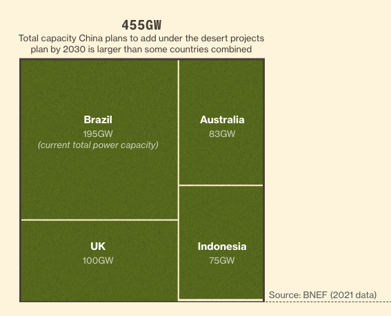시 주석은 2021년 대규모 재생에너지 단지를 만드는 사막 개발 프로젝트 구상을 대내외에 밝혔다. 블룸버그 통신의 분석에 따르면 중국은 사막에 짓는 재생에너지 프로젝트를 통해서 2030년까지 재생에너지 용량을 2022년의 3배가 넘는 약 3.9TW까지 끌어올릴 수 있을 전망이다. 올해 한해 동안만 300GW 이상의 재생에너지 설비가 추가될 것으로 알려졌다. 이는 원전 약 300기를 설치한 것과 같은 수준의 설비용량이다. 지난해 전세계 재생에너지 설비 총량이 338GW였던 점을 감안하면 놀라운 속도의 설비 확충인 셈이다.
